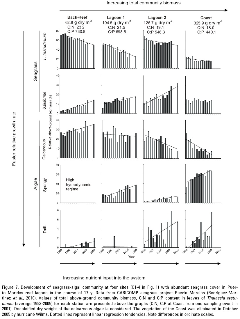 Major disturbances 2: Eutrophication. Over the last three decades, the urban development of Puerto Morelos has increased considerably, with a ten-fold increase in population and establishment of several major hotel complexes. Potential sources of nutrients into the sea are hotels (e.g. from fertilizers for the golf-courses), intensive farming, rubbish disposal and residential sources. The village of Puerto Morelos has no central sewer system and wastes are discharged into septic tanks or directly into the aquifer (see also Fig. 1). The reef system thrives under low natural nutrient concentrations and eutrophication may cause drastic changes in this coastal ecosystem. The seagrass-algal community in the reef lagoon has undergone gradual, almost imperceptible changes over the last decades (Rodríguez-Martínez et al., 2010). Nutrient availability to seagrasses may be derived from C:N:P ratios in the leaf tissues (Duarte, 1992; Fourqurean et al., 1992). Carbonate systems, such as Puerto Morelos reef lagoon, are phosphorus limited (Short et al., 1990; Fourqurean et al., 1992; Carruthers et al., 2005) and the C:P ratio contents in T. testudinum leaves sampled at several sites within the reef lagoon gradually decreased from 1991 to 2005 from average 731:1 to 564:1 (N 4 stations) respectively, indicating increasing availability of phosphorus (Rodríguez-Martínez et al., 2010). The seagrasses T. testudinum and S. filiforme showed a gradual shift to relatively higher biomass invested in above-ground tissues (Rodríguez Martínez et al., 2010), which is consistent with an increasing nutrient load (Zieman & Wetzel, 1980; Erftemeijer & Middelburg, 1993). The total above-ground biomass of the community increased from 1991 to 2005, whereas that of T. testudinum remained constant (Rodríguez-Martínez et al., 2010). Thus, the relative biomass of T. testudinum decreased during that period whereas that of the faster-growing S. filiforme and fleshy and drift macroalgae increased, although these tendencies varied within and between the seagrass and algal groups according to environmental setting and total community biomass (Fig. 7). The calcareous rhizophytic algae, however, showed a distinct tendency with nutrient increase than the other algal groups and their relative abundance decreased when conditions became more eutrophic (Fig. 7). A possible reason may be that at higher densities, light extinction in between the canopy increases (Enríquez & Pantoja-Reyes, 2005) and rhizophytic algae, which are smaller than the seagrass leaves (Cruz-Palacios & Van Tussenbroek, 2005), are likely overshadowed by the seagrasses. Only at the extreme oligotrophic back-reef an increase in the relative abundance of the calcareous increase is observed (Fig. 7). These changes in the community structure also demonstrate that populations of the macroalgae (and fast growing seagrass species) are more dynamic than those of the dominant but slow-growing T. testudinum (see section inter-annual stability). Thus, at a community scale, the algae (and possibly also the faster growing seagrass species) may be better indicators of change than the foundation seagrass T. testudinum. This gradual shift in community structure is consistent with the relative dominance model which predicts that the competitive superiority tends to favor species with faster relative growth rates at increasing nutrient availability (Fourqurean et al., 1995; Rose & Dawes, 1999; Fourqurean & Rutten, 2003). Thus, there are strong indications that Puerto Morelos reef lagoon is slowly changing from a pristine to a more eutrophic system.