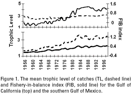 The Fishery-in-Balance index (Pauly et al., 2000) is probably a better indicator of how a fishery is affecting an ecosystem. Independently of the cause, this index expresses how the trophic levels of fish stock are being modified over time with respect to the whole ecosystem. An important similarity between both indices is that they express changes in the ecosystem structure associated with the trophic level of the target fish species.