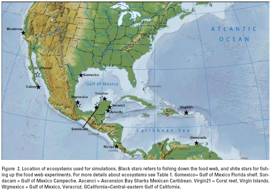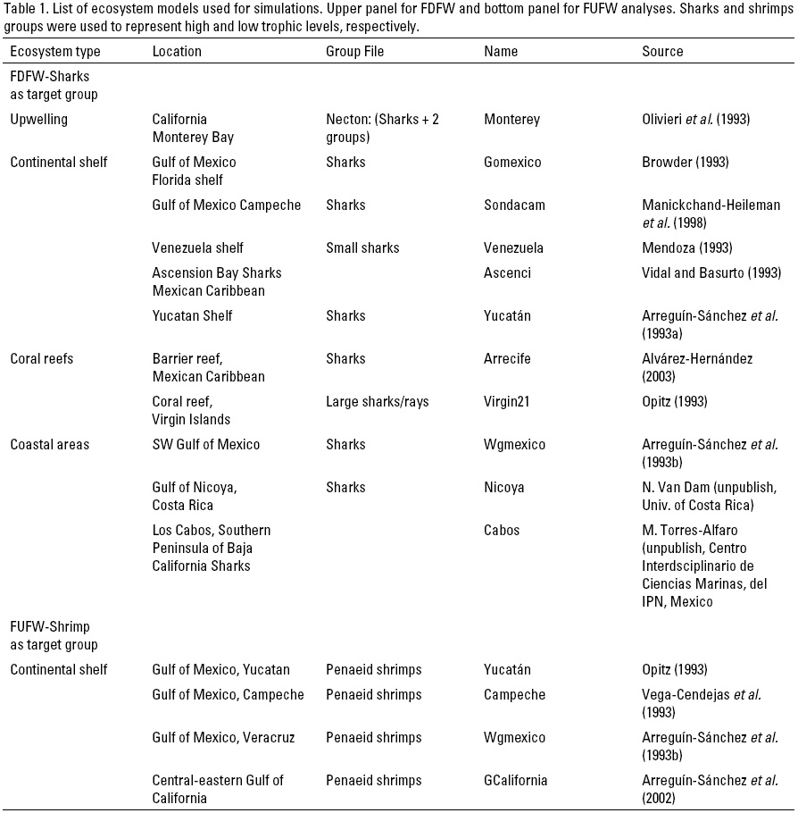 We selected sharks, as representatives of the high trophic level, to simulate the effects under FDFW and because of the characteristics of their life cycle that make them vulnerable to overexplotation (Hoenig & Gruber, 1990; Pratt & Casey, 1990). Conversely, shrimp were selected as representatives of the low trophic level, because this species is economically important, commonly exploited and presents high recovery rates (Arreguín-Sánchez et al., 1997, 2004). The ecosystems selected in both cases are listed in Table 1, and their location is shown in Figure 2.