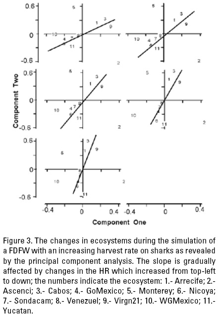 For FUFW, the response to an increasing HR in the Campeche and Central Gulf of California ecosystems results in a positive slope in the PCA diagram, and a negative slope for the Veracruz and Yucatan ecosystems (Fig. 4). Even though the purpose was not to estimate the magnitude of the slopes, they appear to be of similar magnitude but of opposite signs. In this case, the main difference between ecosystems is that those with positive slopes sustain larger fisheries than those with negative slopes. Table 4 shows the relevant weighting factors for the first two components where the significant variables involved in the responses to fishing are the same, independent of the HR level, but have variable effects on the ecosystem dynamics. Moreover, the magnitude of the weighting factors for the ecosystems resulted in similar values for the different HRs (Table 5).