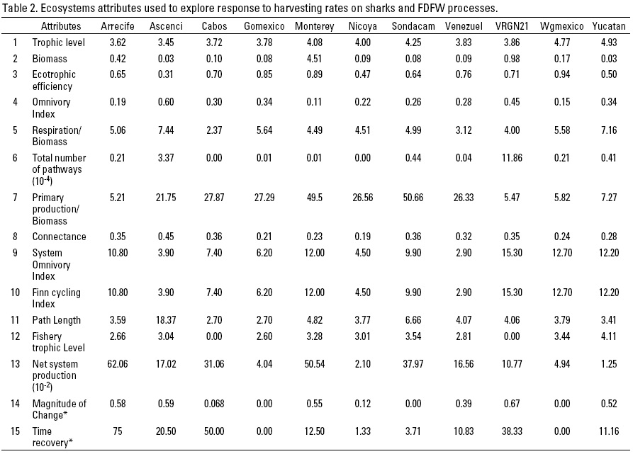 For the FDFW experiments, resilient properties of sharks within their own ecosystems were evaluated using the Ecosim model (Walters et al., 1997). The current state of exploitation for sharks was modified to reflect specific harvesting rate (HR) values representing the proportion of the biomass removed by fishing with respect to the stock biomass. Harvesting rate values ranging between 0.3 and 0.7 (using increments of 0.1) were used during simulations. Starting with an unexploited (HR = 0) ecosystem state, HR was applied for a period of three years (starting in year 1). Some resilient properties were measured in the same manner as defined by other authors (Vasconcelos et al., 1997; Pérez-España & Arreguín-Sánchez, 1999a, b; Arreguín-Sánchez & Manichkand-Heileman, 1998) like persistence, magnitude of change, and recovery time. In each simulation, only parameters no auto-correlated were selected for comparison for the target group and its ecosystem (Table 2).
