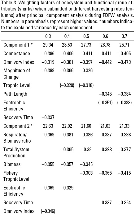 In the case of sharks, the ecosystem parameters computed after the simulations are shown in Table 2. For all of the scenarios (given by different HR values), in the PCA analysis, the first two components explained more than 50% of the total variation in the parameters, and the first three components accounted for 67% of the variation. For each component, higher weighted factors indicate those parameters that contribute more to the explained variance (Table 3). These parameters can be separated into two categories: (1) those related to sharks as a functional group such as trophic behaviour, energetic cost, and how sharks as a group within the ecosystem responded to exploitation, (2) those related to ecosystem attributes (e.g., ecosystem production and trophic structure).