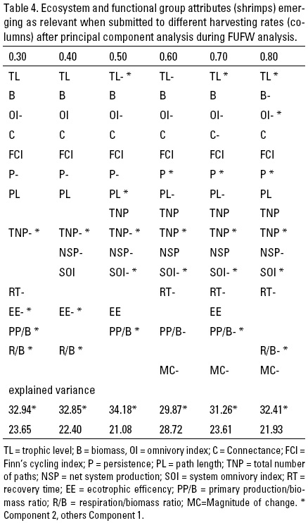 Regarding FUFW, less contrast was observed with respect to the relevant variables influencing mechanisms for stock and ecosystem recovery after exploitation. In fact, from Table 4, we may suggest that the same variables are relevant over the range of simulated HRs that attempted to reflect low and high exploitation. Biomass, omnivory index, trophic level, and resilience properties appear relevant at the stock level. Connectance, Finn cycling index, path length, number of paths, and the system omnivory index are ecosystem structure properties. Net system production, respiration/biomass ratio, and primary production/biomass ratio appear to be relevant ecosystem functional attributes. The only characteristic that appears to be relevant exclusively for high HRs was the magnitude of change.