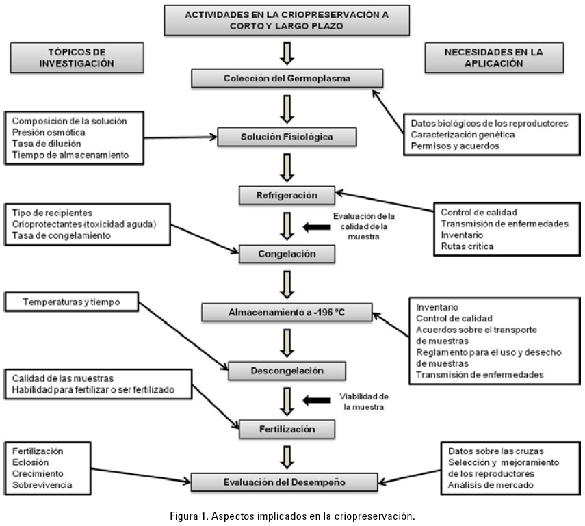 El proceso de la criopreservación en organismos acuáticos se puede desglosar en los siguientes pasos: colección del germoplasma, mantenimiento de muestras en una solución fisiológica o extensora, refrigeración o almacenamiento a corto plazo, congelación, almacenamiento a -196° C, descongelación, fertilización y evaluación del desempeño (Fig. 1).