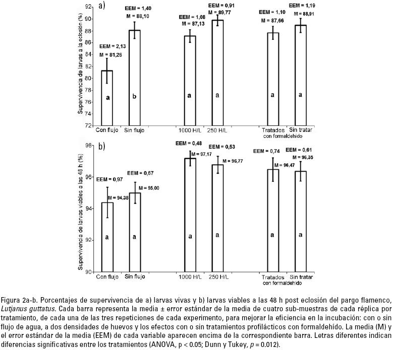Hay diversos reportes de peces marinos en que las tallas en los primeros días después de la eclosión son menores que su talla a la eclosión, como en el pargo rojo de mangle, Lutjanus argentimaculatus (Forsskál, 1775) (Doi et al., 1993), la rabirrubia o canané, Ocyurus chrysurus (Bloch, 1791) (Riley et al., 1995), así como la lisa Mugil liza Valenciennes, 1836) y el robalo chucumite Centropomus parallelus Poey, 1860 (ÁlvarezLajonchère & Hernández Molejón, 2001), lo cual puede deberse a diversas causas, como cambios morfológicos en las larvas durante la reabsorción del saco vitelino, mortalidades más altas de las larvas de mayor talla durante dicho periodo, o el método de muestreo de las larvas, en cuyas muestras no estén bien representadas las larvas de mayores tallas. En el presente estudio, dado el pequeño volumen de los tanques experimentales y la forma de tomar las muestras con la aireación constante, consideramos que la causa haya sido que las larvas de mayor longitud sufrieran una mayor mortalidad en las primeras 48 h después de la eclosión, pues además, este tratamiento presentó supervivencias menores en larvas vivas a la eclosión.