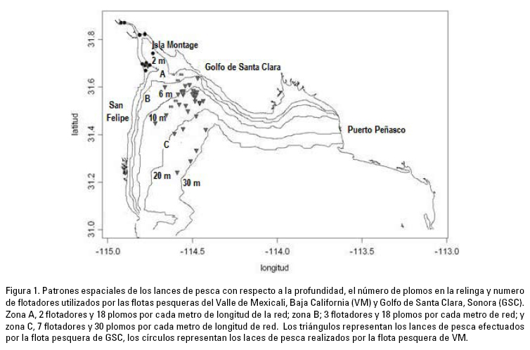 Hasta la temporada 2008-2009, las dos flotas pesqueras difieren en las características de las artes de pesca. Por ejemplo, el armado de la red fue diferente y estaba relacionado con las características de la zona y la profundidad en donde fue utilizado. En la Figura 1, se presenta además los patrones de distribución espacial y las profundidades a las que se efectuaron los lances de pesca, relacionado con el número de flotadores y plomos. En la zona A, se utilizaron redes con 2 flotadores y 18 plomos por cada metro de longitud; en la zona B, se utilizaron redes con 3 flotadores y 18 plomos por cada metro de longitud y en la zona C, se utilizaron 7 flotadores y 30 plomos por cada metro de longitud (Tabla 2). Se observa que las redes operadas desde las embarcaciones de Santa Clara utilizaron mayor cantidad de flotadores y plomos (zonas B y C), tal vez para que el arte de pesca abarcara una mayor superficie en su operación. Por su parte, las embarcaciones del Valle de Mexicali, muestran que el número de plomos por cada 10 m de longitud de red es en menor cantidad debido a la gran cantidad de sedimentos.