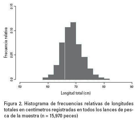 En cuanto al análisis de las tallas, se registraron un total de 15,970 mediciones de la longitud total (cm) de ejemplares de curvina golfina (C. othonopterus) en la muestra. El 99% de los valores de longitud se incluyen en un intervalo entre 51 y 88 cm, registrándose una media aritmética de 69 cm igual que la mediana, lo que significa que la distribución de frecuencias es simétrica con respecto a su valor central (Tabla 3). Asimismo, se observó que el 50% de los registros centrales de tallas (longitud total en centímetros), estuvo entre 67 y 71 cm. Con los valores resultantes de estas estadísticas es posible concluir que la muestra de tallas tiene una forma simétrica en torno al valor de 69 cm y que muestra una baja variabilidad, de tal forma que en un intervalo de 4 cm se tiene el 50% de los datos centrales (Fig. 2).