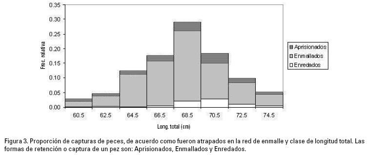 Para determinar la efectividad de captura de las redes de enmalle de acuerdo al tamaño de la luz de malla y tipo de captura (enmallados, atrapados o enredados), se realizó una inspección del tipo de captura de cada uno de los 792 individuos de las sub-muestras y su relación con la talla. En la figura 3 se presenta las proporciones de las categorías de captura por clase de longitud total. Se puede observar que más de 95% de los peces fueron capturados a través de su abertura opercular (enmallados); ésta es la forma adecuada como debe funcionar una red agallera o de enmalle (Sparre & Venema, 1997). También se observó que en todas las clases de talla representadas se registraron ejemplares aprisionados en la red; sin embargo, los mayores porcentajes de este tipo de captura se encontraron en las clases de 68.5 cm y 70.5 cm. Por otro lado, los peces "enredados" solamente se observaron para las tallas grandes. Lo anterior indica que la relación entre los peces y las redes agalleras es muy compleja.
