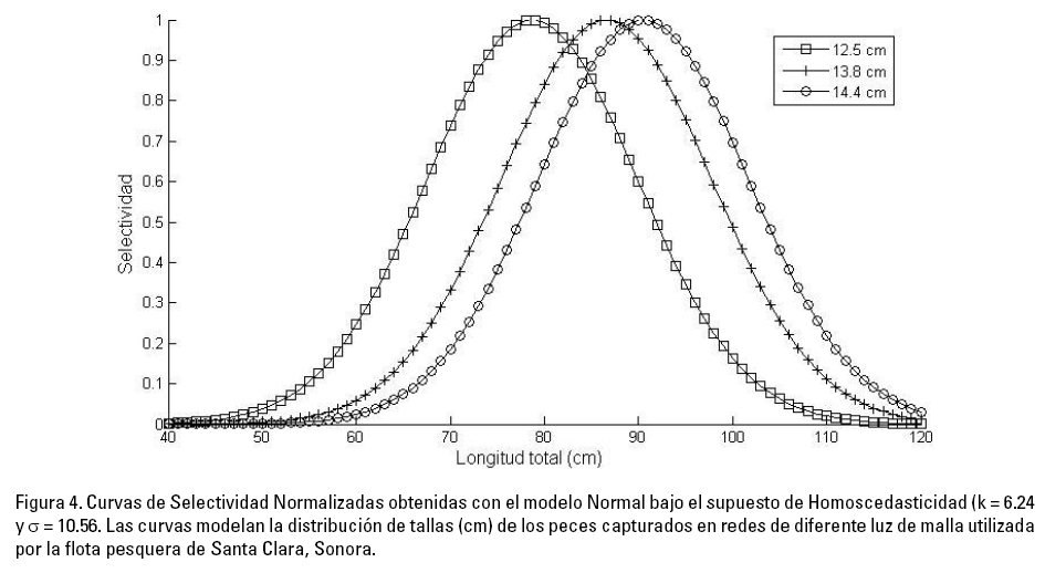 Para los datos provenientes del puerto de Santa Clara, Sonora las curvas de selectividad de cada tamaño de malla fueron parametrizadas por medio del modelo de probabilidad normal, suponiendo igual varianza y poder de pesca. El modelo permitió estimar los valores de tallas óptimas de captura de las tres aberturas de malla 12.7, 13.9 y 14.6 cm. Los valores óptimos se situaron en 78.0, 85.6 y 89.7 cm., respectivamente. Con estas tallas se obtuvieron las respectivas curvas de selectividad donde se sugiere que las redes con luz de malla de 14.6 cm cumplen con el precepto de norma en cuanto a la talla de primera reproducción de curvina golfina que es estimada en 65 cm. Esta misma conclusión se deriva del análisis efectuado para la información proveniente del sitio de desembarco del Valle de Mexicali, B.C. De acuerdo con la Norma Oficial Mexicana, se recomienda que en las capturas no se retenga más del 35% de ejemplares menores a los 65 cm.