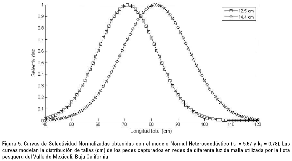 Por su parte, en la Tabla 5 se presentan los valores estimados de los diferentes modelos obtenidos para las mallas utilizadas en el Valle de Mexicali (El Zanjón). Para este caso, de acuerdo con la desviación de los residuales, el mejor modelo fue la función de probabilidad normal con varianzas diferentes para cada malla (heteroscedástico). Obsérvese que en esta zona solamente se utilizan dos tamaños de malla. Según los parámetros de este modelo y bajo el principio de similitud geométrica, la longitud a la cual se obtuviera 100% de retención de esa clase en la malla de 12.7 cm. fue de 71.3 cm y para la malla de 14.6 cm. fue de 90 cm. En la Figura 5 se muestran las curvas de selectividad normalizadas de acuerdo con el modelo escogido. Como en el caso anterior, se observó que solamente las redes con luz de malla de 14.6 cm cumplen con la normatividad vigente para la pesca de curvina golfina.