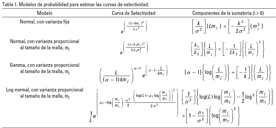 Para el análisis de la selectividad, se adaptó el método propuesto por Millar & Holst (1997), que consiste en definir un modelo Log-lineal para estimar las curvas de selectividad de los diferentes tamaños de luz de malla simultáneamente. Su ventaja es la amplia variedad de modelos de tipo exponencial que permiten modelar diversas estructuras de distribución empírica, resultado de muestreos aleatorios (McCullag & Nelder, 1989; Chambers & Hastie, 1992; Hastie & Tibshiranie, 1990). De esta forma, para ajustar algún modelo Log-Lineal, se supone que en cada clase de longitud definida (L), la captura del número de peces yij en un j-ésimo tamaño de luz de malla se distribuye asintóticamente como un función de probabilidad Poisson; es decir: