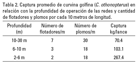 La flota pesquera del Alto Golfo de California de esta especie se compone de pequeñas embarcaciones de aproximadamente 6 m de eslora, dotadas con motores fuera de borda de 60 a 120 HP. La flota tiene su base en tres principales puertos: 1) Santa Clara, Sonora con aproximadamente 400 embarcaciones; 2) San Felipe, B.C. con 300 embarcaciones y 3) El Valle de Mexicali, BC con 100 unidades pesqueras. De acuerdo con la norma mexicana, las actividades de pesca de curvina golfina se verifican desde octubre hasta abril; sin embargo, en marzo y abril es cuando se obtienen los mayores rendimientos pesqueros. Las maniobras de pesca se realizan durante los movimientos de marea, aproximadamente tres a cuatro días por evento, utilizando una red de enmalle. Las dimensiones de las artes de pesca, materiales para su construcción, número de plomos, etc., son semejantes entre flotas pesqueras (Roman-Rodriguez, 2000). Sin embargo, hasta la temporada de pesca 2008-2009 la luz de malla de las redes registraba diferentes tamaños desde 7.6 cm (3.0 pulgadas) hasta 16.5 cm (6.5 pulgadas) y, en su mayoría, no cumplían con las especificaciones consignadas en el instrumento de regulación.