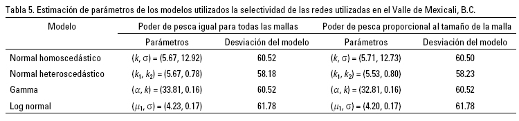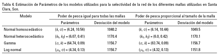 Donde fi(j,L) denota un término que solamente es función de j, de L o de ambos. De este modo el modelo de Máxima Verosimilitud es un modelo log-lineal. Esto puede ajustarse empíricamente por el uso de Modelos Lineales Generalizados suponiendo diferentes funciones de enlace; algunos modelos utilizados como función de enlace para este tipo de modelos se presentan en la Tabla 1. Estas funciones son aplicadas bajo los siguientes supuestos: 1) El poder de pesca no varía con el tamaño de la malla, o 2) El poder de pesca varía con el tamaño de la malla. Cada modelo y supuesto se aplicó de manera separada en los dos sitios de desembarco: Valle de Mexicali ("El Zanjón"), B.C. y Golfo de Santa Clara, Son. De esta forma, en la modelación de los datos se probaron 16 modelos diferentes, de los cuales sólo dos fueron escogidos, uno para cada sitio. La modelación se desarrolló mediante la implementación y adaptación de algoritmos en S-plus versión 8.0 y en MatLab versión 7.6.