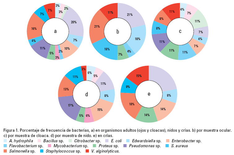 Del total de cepas encontradas, siete se obtuvieron de las muestras oculares, 12 de las muestras cloacales, 11 de los nidos y seis de las crías (Fig. 2): Las cuatro siguientes resultaron comunes a todos los tipos de muestra: Edwardsiella sp., E. coli., Salmonella sp. y V. alginolyticus (Fig. 1b-e).