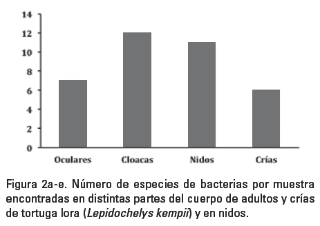En este trabajo, se registraron 14 especies de bacterias, una menos de las 15 identificadas en Lepidochelys olivacea (Fitzinger, 1843) por Santoro et al. (2006), en el cual, se analizaron 45 organismos en las costas del Pacífico al norte de Costa Rica. Las características de las playas de anidación de las especies de tortugas podrían ser un factor que influyó en esta leve diferencia. La playa Nancite (provincia de Guanacaste, Costa Rica), presenta una gran afluencia turística, que podría traer como consecuencia una elevada contaminación de la playa, la cual contribuiría a la abundancia de agentes patógenos que podrían afectar la salud de las tortugas marinas. Por el contrario, el área de estudio del presente trabajo (playa Barra Galindo, Veracruz) no es un sitio turístico. Además, es un área de conservación donde se promueven acciones encaminadas a la conservación, protección y rescate de la tortuga marina, por tanto no presenta alteraciones antrópicas.