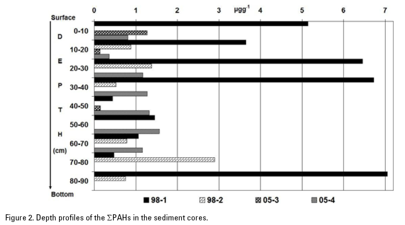 PAHs. The average ΣPAHs in each core, the Pearson's (r) correlation coefficient, as well as the significance (p) obtained from the relationship between ΣPAHs and the organic matter content are presented in Table 2. Only 98-2 and 05-4 cores showed a significant correlation between ΣPAHs and OM as a result of their similar seasonal inputs to the lagoon ecosystem. For PAHs, core 98-1 has the greatest average with 3.25 μgg-1, followed by core 05-4 with 1.10 μgg-1. The other cores had lower averages, from 0.80 to 0.31 μgg-1 for 98-2 and 05-3, respectively. In the 1998 cores, the general trend indicates that the upper layers, between 0 and 40 cm depth, had the greatest levels of ΣPAHs; exceptions were recorded for both cores of this year. In 98-1 the greatest value of 7.06 μgg-1 was found in the deepest layer (90 cm) and in 98-2 this was recorded at a depth of 80 cm. In contrast, the 2005 cores presented a different pattern; for 05-3, the ΣPAHs was approximately one order of magnitude lower, and was detected only in three layers, in the two upper layers (0-20 cm) and in the deeper layer at 50 cm depth. For core 05-4 the aromatic hydrocarbon concentrations were higher at greater depths, particularly at 40 to 70 cm (Fig. 2).