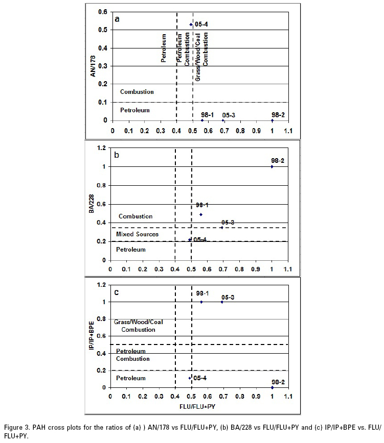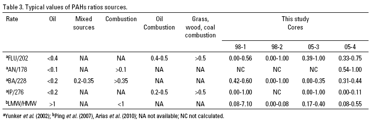 Ratios of the principal mass 178, 202, 228 and 276 parent PAHs such as AN/(AN+PHE) have been used for the differentiation whether PAHs origin is oil or combustion, FLU/(FLU+PY) to identify oil combustion from other types of combustion, and Bal(BA+CR) and IP/(IP+BPE) to identify sources of combustion (Yunker et al., 2002; Arias et al., 2010; da Silva & Bícego, 2010) (Table 3). Due to the low record of individual PAHs, it was only possible to calculate these ratios for some of the layers of the analyzed cores. Globally, for core 98-1 a dominant source from plant pyrolysis was obtained, in core 98-2 it was estimated only for layer 8 at 80 cm depth originated from plant pyrolysis, in core 05-3 they were estimated only in the first two layers. In the surface layer (0-10 cm) there was a mixture of sources, of the py-rolysis of fossil combustion and the burning of plant matter, and in the next layer (10-20 cm) the dominant footprint was that of the combustion of seagrasses, wood and carbon. In core 05-4 more compounds were detected, and the pattern obtained for the origin of the PAHs showed dominant plant combustion processes, with a lower contribution from oil combustion in the surface layer (0-10 cm), as well as from mixed sources in the 60 cm deep layer (Fig. 3). In order to complement this information on the main sources of the PAHs, the ratio LMW/HMW was used to indicate the relationship between the low molecular weight PAHs (≤ 3 rings) and those of high molecular weight (≥ 4 rings) (Ping et al., 2007; Arias et al., 2010; Sánchez-García et al., 2010). Practically all the strata of the sedimentary columns presented the same pattern. They indicated an old PAH contamination, with a dominance of high molecular weight hydrocarbons (≥ 202) that remain for longer in the environment, and have been reported to be generated by pyrolytic processes. The exception was core 98-1 at a depth of 90 cm with a LMW/HMW value of 7.1, which indicates a dominant source from oil, possibly produced by natural filtrations that are characteristic of the region (Table 3) (Tam et al., 2001; Yuam et al., 2001).