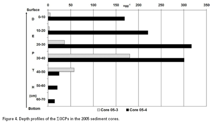 The sediment column. Heptachlor epoxide at 40 and 50 cm deep, lindane at 40 cm and p,p'-DDT in the deepest layer (50 cm) were also found. The molecular pattern in core 05-4 was different; the first three strata, from 0 to 30 cm presented a great variety of pesticides, of this layers, beta-HCH had the greatest concentration at 134.24 ngg-1; only in layer 4 (40 cm) lindane was found as the dominant compound at 1.95 ngg-1. Of the aromatic family of the organochlorine pesticides, there was more DDT than its metabolites; p,p'-DDE was detected at 40 cm only. Cyclodiene, endosulfan sulphate and heptachlor epoxide were the most relevant; the first one had the highest concentration of OCPs with 163.2 ngg-1. From the point of view of the intrinsic toxicity of the sediments in relation to the benthos, the OCPs group counts only with reference values such as the ERL (effects range-low) and the ERM (effects range-medium), for the p,p'-DDT (1.0-7.0 ngg-1) and the dieldrin (0.02-8.0 ngg-1) (Buchman, 2008). The concentrations obtained for the DDT were above these sedimentary quality guides, mainly at 30 and 40 cm in core 05-4, with 23.9 and 21.7 ngg-1 of this xenobiotic, which means there is a greater probability of causing damage to the benthos. In the case of dieldrin, this was detected only in core 05-4 at the surface (0-10 cm) at 2.65 ngg-1, and at 30 cm at 1.91 ngg-1. These concentrations were >ERL but <ERM, suggesting there is a lower probability of affecting the benthic community. Environmental monitoring is required because of the persistence, lipophylicity and synergism of these compounds.