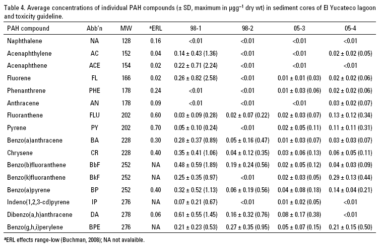 The most relevant PAHs recorded in these cores were benzo(k)fluoranthene, dibenzo(a,h)anthracene and benzo(g,h,i)-perylene. Low molecular weight compounds were also recorded, including acenaphthylene and acenaphthene of the petrogenic type (Table 4). Benzo(a)pyrene and dibenzo(a,h)anthracene were also detected, which were classified by the IARC (2010) as carcinogenic for humans (group 1) and probably carcinogenic (group 2A), respectively. Both had maximum concentrations up to one order of magnitude greater than the value established by the international criteria of sediment quality effects range-low (ERL), (Buchman, 2008), that gives an indication of the real risk of damage to the benthic community.