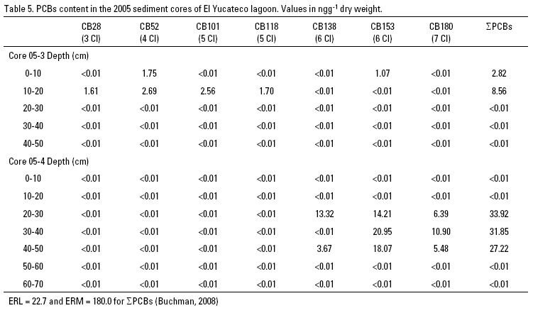 PCBs. PCBs were only recorded in the 2005 cores. The greatest concentrations of ΣPCBs were found in core 05-4 with maximum of 33.92 ngg-1 at a depth of 30 cm and an average value of 13.28 ± 16.7 ngg-1; the core 05-3 had average of 2.28 ± 3.7 ngg-1 with maximum of 8.56 ngg-1 at 20 cm; for the core 05-4, the first two strata were the only ones with biphenyl contents below the ERL. In contrast, strata 3 (20-30 cm), 4 (30-40 cm) and 5 (40-50 cm) of core 05-4 had concentrations of these compounds greater than the ERL (Table 5). The molecular profile of the congeners was also different among the studied cores. PCB52 and PCB101, with 4 and 5 molecular chlorines respectively, dominated in core 05-3, whereas in core 05-4 there was a greater abundance of PCB138, PCB153 and PCB180, with 6 or 7 chlorines in their chemicalstructure, that were more persistent and lipophilic. Correlationsbetween PCBs and organic matter to the cores of 2005 were notsignificant(p>0.05)