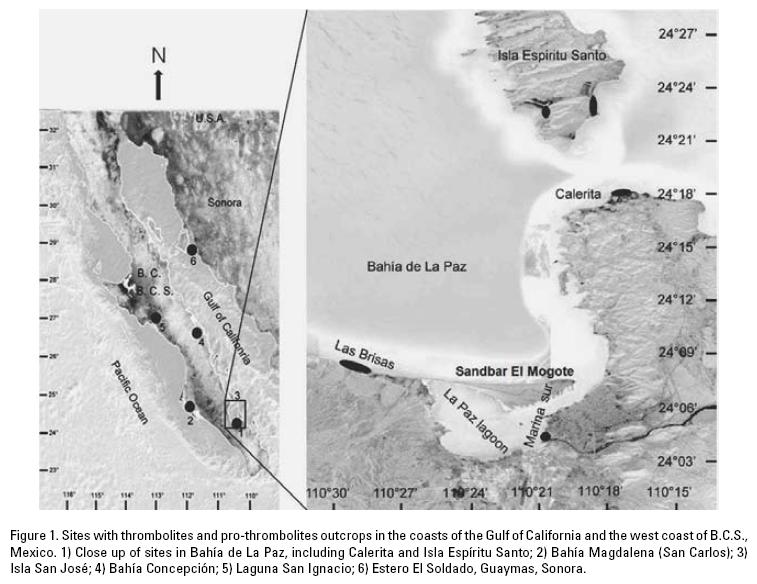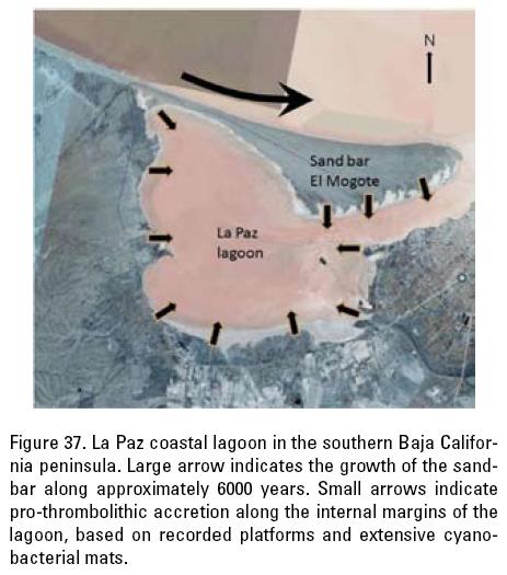 La Paz lagoon in Bahía de La Paz, Mexico (Fig. 1) began forming around 6000 years ago by coastal transportation and deposition of sediments, eventually forming a sandbar, and transforming a primitive cove into the present coastal lagoon (Nava-Sánchez & Cruz-Orozco, 1989). Notwithstanding, the hypothetical spit proposed by the former authors needed to trigger-off and mantain the growth of the sandbar lacked a feasible origin. It was thus proposed that pro-thrombolithic growth might have defined the hypothetical spit where the armpit of the La Paz lagoon is defined. Through continuous growth, this provided a basement for the development of the sandbar El Mogote that transformed the primitive cove into the (Ensenada de La Paz lagoon (Siqueiros Beltrones, 2008).