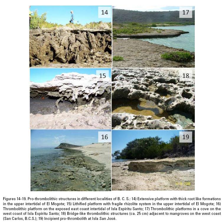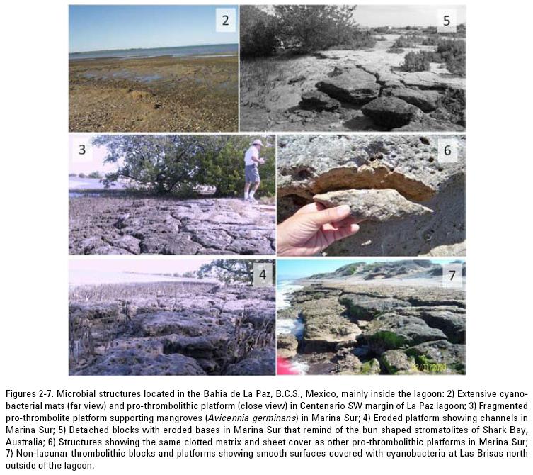 The very similar geomorphology of most coastal lagoons in the Gulf of California, also lead us to hypothesize that the process of formation involving pro-thrombolithic development in all cases could be the same. It was later suspected that the pro-thrombolithic platforms might have played and could still be playing an essential role in the geomorphological development of coastal lagoons in all the NW region of Mexico through seaward accretion of pro-thrombolites and bar formation. Additionally, recently gathered stratigraphic evidence suggested that pro-thrombolithic processes are responsible for the formation of the substrates around the La Paz lagoon (and probably others) supporting mangrove forests and human settlements (Siqueiros-Beltrones et al., 2009).