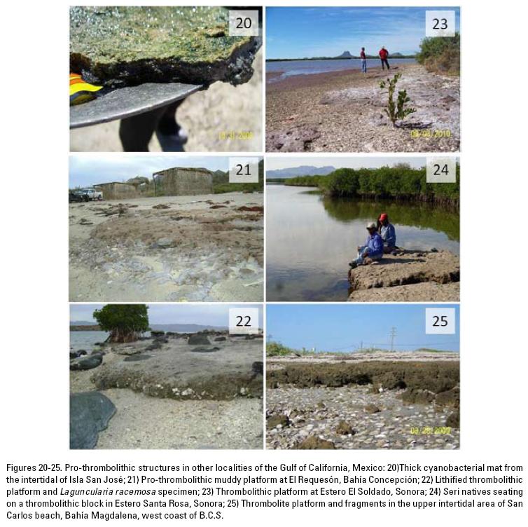 This work was supported by grants from projects IPN-SIP: 20080010, 20090154 and 20100036, Influencia de protrombolitos en la geomorfología de lagunas costeras del Golfo de California (I, II, III). Uri Argumedo helped with sample processing and field photograph; Rubén García aided in field work and with image editing. Diana Luque "Ecoturismo Seri, CIAD and CtamCoyai, A.C., Sonora" provided the thrombolites image from Estero Santa Rosa, and Alejandra Álvarez edited figures1 and 37. English edition was done by Diana Dorantes Salas in an earlier MS. We thank Hugo Beraldi, three anonymous reviewers, and Rosaluz Tavera for their observations. The first and third authors are COFAA and EDI fellows at IPN.
