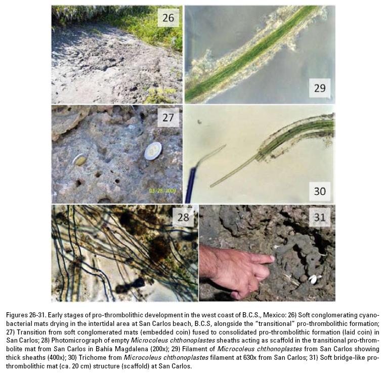 According to the above hypothesis, in the margins of coastal lagoon cyanobacterial mats continue to evolve into conglomerated mats that generate unconsolidated pro-thrombolites (SiqueirosBeltrones, 2008). Although previous mineralogical analysis of prothrombolites showed the presence of cementing microcrystalline calcite (micrite) these structures are unlithified and represent an intermediate stage between microbial mats and thrombolites. This substrate can be colonized by mangroves, which are common in tropical coastal lagoons. However, answers to the following questions are compelling, is this thrombolithic accretion process found exclusively in coastal lagoon environments? Can we confirm the transition from growing microbial mats to pro-thrombolites to thrombolites? Are thrombolithic structures the common substrate for mangroves?