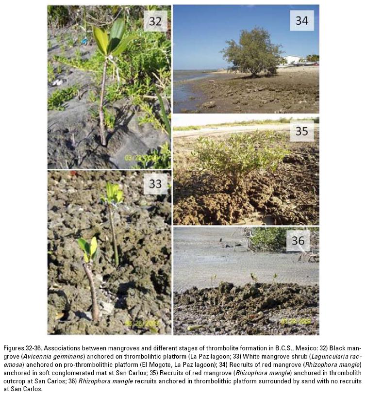 Finally, concerning our question: are thrombolithic structures the common substrate for mangroves? Our observations show that both mangrove recruits and trees were only anchored either in conglomerated mats or in thrombolithic/pro-thrombolithic outgrowths but not in the bordering sand (Fig. 32-36). (33, 34, 35) Our hypothesis is thus consistent with our observations in all the sites, i.e., mangroves use the preformed structures by cyanobacterial mats (conglomerate mats, pro-thrombolites, thrombolites) as fixing substrate. Nonetheless, mangrove trees were seen anchored on other nonthrombolithic rocky substrata, as in Isla San José where incipient pro-thrombolithic formations were recorded (Figs. 19-20).