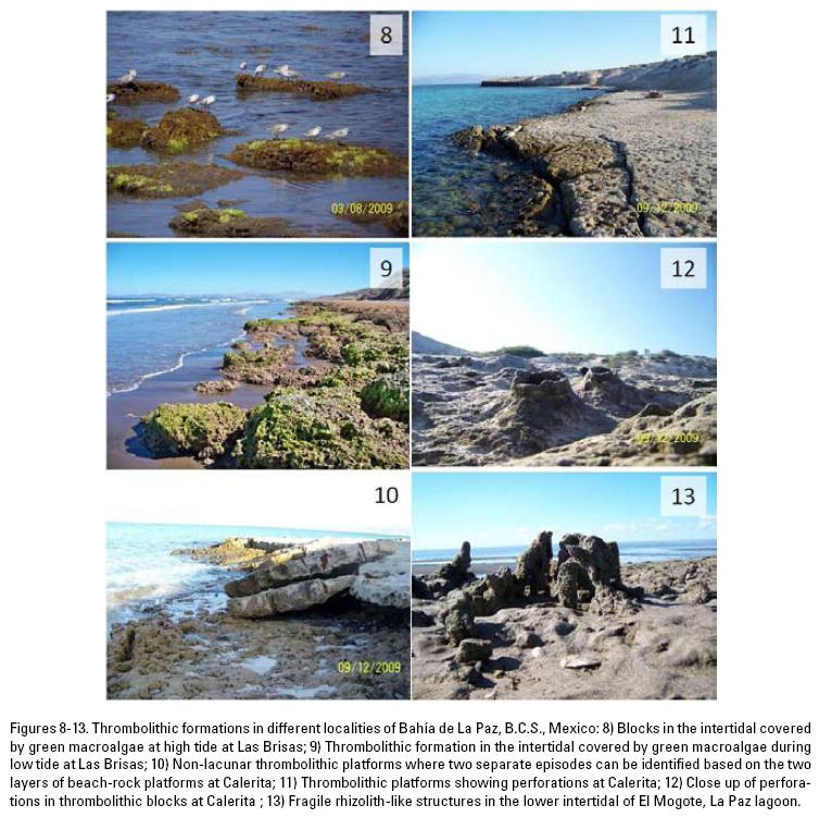 Because lagoon-like environments are evident in the island coves in the southern Gulf of California, explorations were done at Isla Espíritu Santo and Isla San José where mangrove forests are well established. Additionally, observations on thrombolithic-like platforms and blocks outside lacunar environments in the Gulf of California are graphically documented to the north (Calerita) and northwest (Las Brisas) of the La Paz lagoon, inside Bahía de La Paz in the southern Gulf. In this case the null hypothesis stated that such structures would not be found inasmuch as the explored sites were not lacunar environments.
