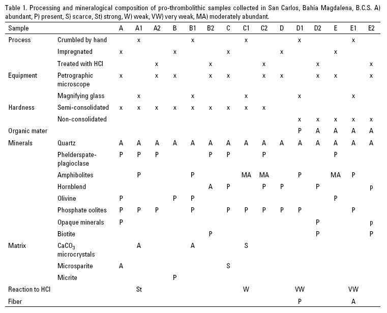 Analysis of thrombolithic and pro-thrombolithic structures. As previously described for the La Paz lagoon (Siqueiros-Beltrones, 2008), samples of consolidated and soft structures from San Carlos were examined to determine their degree of consolidation and for textural and mineralogical analysis; these included: a) fragment of semi-consolidated pro-thrombolite; b) isolated root like sedimentary structures; c) root-like structures associated to pro-thrombolite; d) soft desiccating mat associated to pro-thrombolite; e) soft isolated microbial mat. In order to examine the samples, textural analyses were made in six different ways: 1) A part was broken down by hand, and the analysis was conducted using a laser particle analyzer (LPA); 2) 15% HCl was added to a subsample to eliminate carbonated matter, and a textural analysis was done with the LPA; 3) This subsample was disintegrated by hand, and acetone and hexametaphosphate were added to remove organic matter and to preclude the cohesion between grains, respectively; texture analysis was done with the LPA; 4) This part was impregnated with epoxy to make a thin section, and the components were described under a petrographic microscope; 5) This subsample was disintegrated by hand, and its components were described under a stereoscope; 6) The subsample was treated with 15% HCl to eliminate carbonates; thin sections were examined under a petrographic microscope (Table 1).
