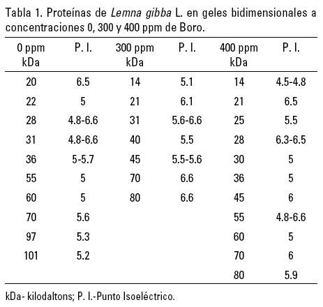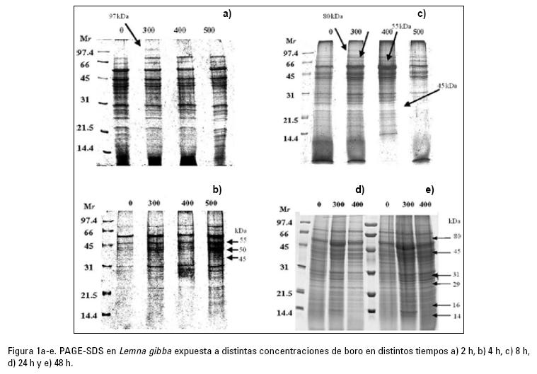 Electroforesis monodimensional de poliacrilamida en presencia de SDS (PAGE-SDS). Una respuesta interesante en L. gibba ante la presencia del boro fue que repetidas veces presentó la expresión de las mismas proteínas cuando fue expuesta a 300 ppm, lo cual indica que su nivel de tolerancia a la presencia de boro es alto.