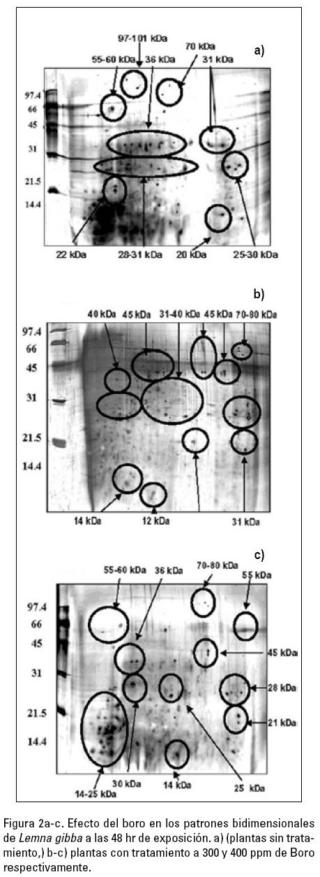 Separación de proteínas mediante electroforesis bidimensional en presencia de SDS (PAGE-SDS 2-D). A las 48 h de exposición al boro se observó el incremento de proteínas de 14, 21, 25, 30 y de 40, 45, 55, 60 y 80 kDa en las concentraciones de 300 y 400 ppm respectivamente (Fig. 2b-c). En el control apareció una proteína de 97 kDa y otra de 101 kDa, que no se observaron en ninguno de los demás tratamientos (Fig. 2a). En la concentración de 300 ppm se apreció la sobreexpresión de un grupo de proteínas de 45 kDa, mientras que en la de 400 ppm, no se observó el incremento de esas proteínas.
