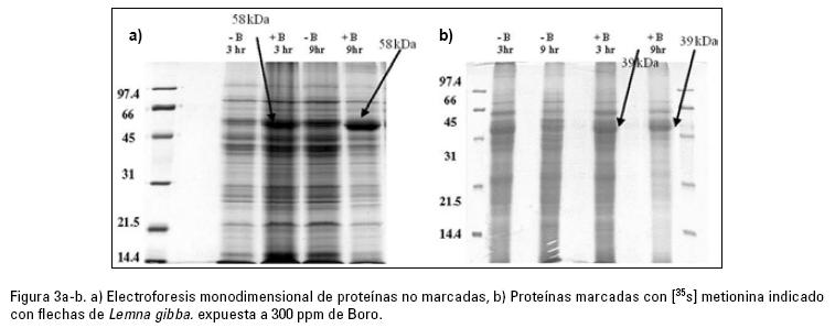 Marcaje y autoradiografía. Se observó un aumento en la síntesis de proteínas a las 3 h de exposición al boro, mientras que a las 9 h de exposición, la síntesis disminuyó en los grupos experimentales con respecto al control (Fig. 3a-b). Aparentemente existe una síntesis de nuevas proteínas por presencia de boro al inicio del tratamiento, sin embargo, se presentaron muchas proteínas marcadas (Fig. 3b), lo que al compararse con el patrón electroforético de L. gibba en las mismas condiciones pero sin marca radioactiva, mostró gran similitud en la síntesis de proteínas (Fig. 3a), indicando así que muy probablemente no existe una marca selectiva. Como se observa en la Figura 3a-b, se sobreexpresaron proteínas de 55 kDa en ambas condiciones.
