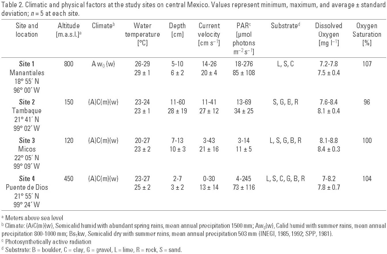 Water conditions. Blennothrix ganeshii populations from central Mexico are present under particular chemical and physical conditions: alkaline waters (2.7-4.8 meql-1) dominated by SO42-/HCO3 - and Ca2+/Mg2+, warm temperature (23-29 °C), shallow depth (3-28 cm), moderate current velocity (13-27 cm s-1), high percentage of oxygen saturation (96-107%) and different types of substrata (lime, sand, clay, gravel, boulder or rock). Stream segments were shaded or partly shaded (11-85 µmol photons m-2 s -1; Table 1 and Table 2).