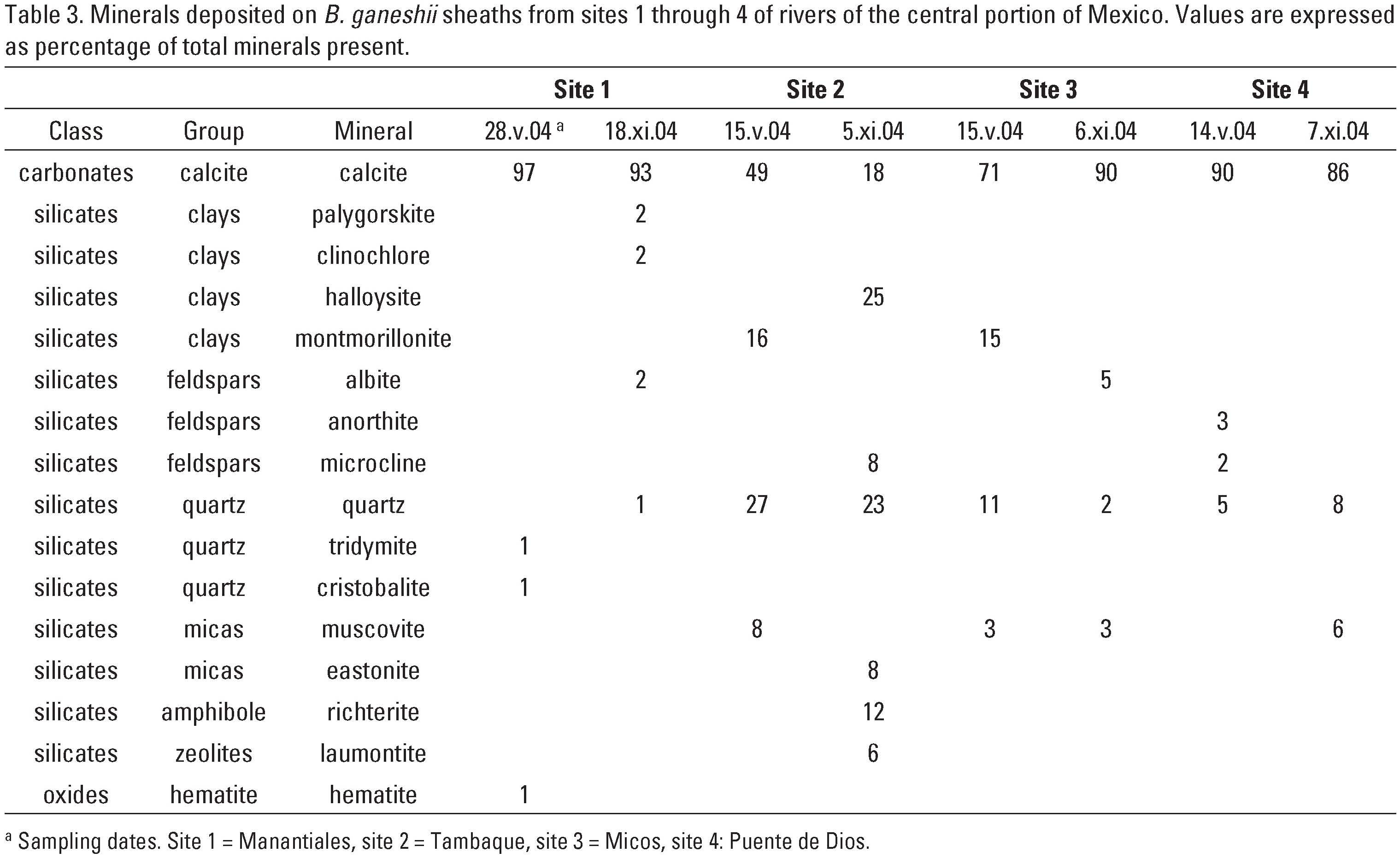 X-ray diffraction showed a high number of minerals (carbonates, silicates and oxides) deposited on B. ganeshii sheaths (Table 3). XRD analyses indicated that calcite was the only phase of CaCO3 present in readily detectable amounts at all sites. Sites 1, 3 and 4 had the highest proportion of calcite (average = 95, 81 and 88%, respectively). A temporal variation in precipitate minerals around the sheaths was recorded in all sampling sites. A comparison among seasons showed that major calcification occurred in the dry season, when higher SI values were found, except in site 3, which had a negative SI value.