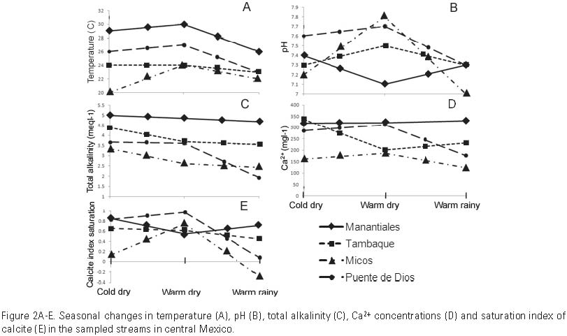Seasonal variations in temperature, pH, total alkalinities and concentration of Ca2+ are shown in Figs. 2A-D. The highest temperatures were recorded at site 1 throughout the sampling period. The pH of stream water varied over a small range of values (7.0-7.9), generally with a slight increase during the warm dry season, except for site 1. Total alkalinities showed no differences during the seasons at site 1. At sites 2, 3 and 4, lower values were detected during the warm season. Variations in Ca2+ and ionic concentration between sampling dates were noted at sites 2, 3 and 4, with higher concentrations during dry seasons and lower during rainy seasons, showing a seasonal dilution process. Virtually no variation in Ca2+ ions was detected at site 1 during the sampling period.
