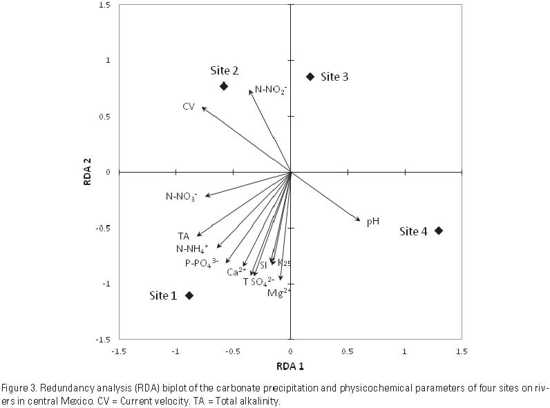 Calcification. All studied populations were characterized by calcium carbonate precipitation around the sheaths and were found in shallow water conditions, even when substantial parts of the mat were outside the water column, facilitating evaporation processes and cementation of minerals. Variability in precipitation was found between populations at different sites. Samples from sites 1 and 4 had the highest mean carbonate precipitation regardless of sampling season (31 and 36%, respectively), whereas populations from sites 2 and 3 showed the lowest precipitation (13 and 16%, respectively). The eigenvalues of the first two RDA axes were high (RDA1, 0.66 and RDA2, 0.33) when compared with subsequent axes, and they accounted for 99% of the variance in carbonate precipitation (Fig. 3). Both axes accounted for 99% of the variance in the relationship between carbonate precipitation at the four sites and environmental variables. The results of the permutation tests revealed the statistical significance (p ≤ 0.05) of the effects of current velocity and N-NO2 - at sites 2 and 3; total alkalinity, K25, SO42-, Ca2+, Mg2+, temperature, P-PO43- and SI at site 1, and pH and SI at site 4. No differences in total alkalinity among the seasons at site 1 were associated with the direction of the distribution pattern of carbonate precipitation.