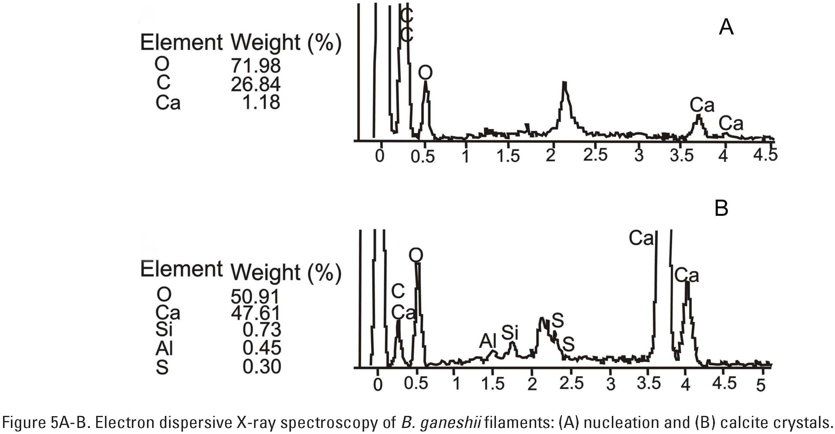Calcification occurred as dense, thick encrustation around the sheaths, creating micritic (metabolically induced, but environmentally dependent) tubes typically 10-25 µm thick enclosing B. ganeshii filaments (Figs. 4A, C). The calcareous tubes around the filaments were separate from each other. Distal ends of the filaments remained uncalcified, and allowing trichomes to be visible (Fig. 4E). Calcite crystals displayed a rhombohedral form with triangular surfaces and irregular disposition (Figs. 4C-D), forming the "gothic arch crystals" described by Rainey and Jones (2009). Scanning-electron-microscopic examination of the initial precipitate nucleation indicates the presence of calcium carbonate particles with diameters that range from several tenths of a micrometer to as much as 1 micrometer on the polysaccharide sheath (Fig. 4B). EDXS of these precipitates showed they contained a lower Ca2+ percentage than the fully formed calcite crystals (Fig. 5A-B). Inclusions contained Ca2+ as a major element. Around the sheaths, the calcite coating was enlarged (up to five times the diameter of the trichome) mainly by the addition of calcite crystals, which grouped themselves in cylindrical tubes (Fig. 4F).