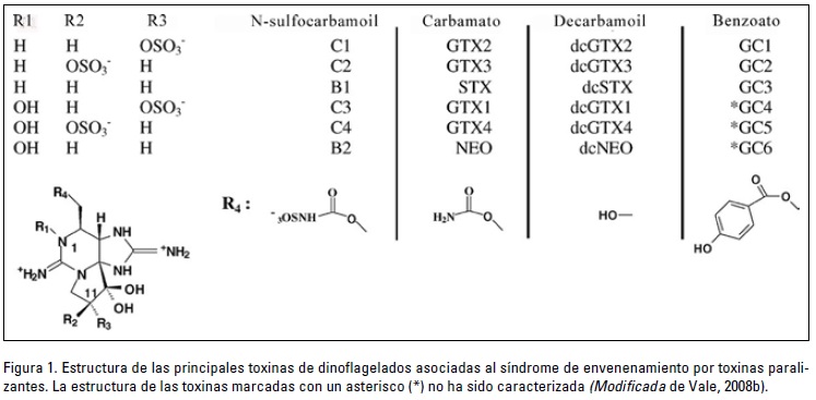 La STX es una molécula pequeña, con un peso molecular de 299. Presenta un sistema tricíclico que contiene dos grupos guanidino, los cuales le confieren una gran polaridad, por lo que es extremadamente estable en soluciones biológicas y fisiológicas. La STX muestra una alta solubilidad en agua, menor en alcohol y es insoluble en disolventes orgánicos (Wiese et al., 2010). Esta toxina exhibe un número sorprendente de análogos naturales, en los cuales hay variaciones en la cadena lateral carbamoil, en el nitrógeno 1 (N1) y en el carbono 11 (C11). En los análogos hidrofílicos de G. catenatum, las variaciones en la cadena lateral pueden ser, desde carecer de ella hasta presentar un grupo sulfato o benzoato. El N1 puede ser hidroxilado y el C11 puede albergar grupos sulfato (Llewellyn, 2006). Entre estos análogos se encuentran la STX, NeoSTX, gonyautoxina (GTX), B1, B2, C1, C2, C3, C4, decarbamoil (dc) STX, dcNeoSTX, dcGTX, entre otras (Vale, 2008b) (Fig. 1). De éstos, la STX es el análogo más potente y las de menor potencia son las toxinas B y C (Fusetani & Kem, 2009).