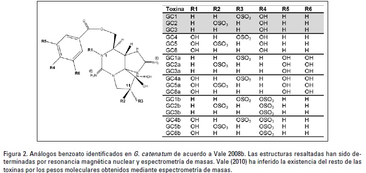 Tradicionalmente los análogos de STX estudiados han sido únicamente compuestos hidrofílicos. En el 2003, tres nuevos análogos "hidrofóbicos", los análogos tipo benzoato, fueron aislados de cepas australianas de G. catenatum como una fracción importante de las toxinas (hasta 100% en porcentaje molar en una cepa australiana), y han sido nombradas toxinas GC1, GC2 y GC3 (Negri et al., 2003). Más tarde se sospechó la existencia de un mayor número de análogos: los N1-hidroxil de GC1 a GC3 (GC4 a GC6), los di-hidroxibenzoato (de GC1a a GC6a) y los sulfato-benzoato (de GC1b a GC6b) (Vale, 2008b) (Fig. 2). Es importante considerar el efecto de las toxinas tipo benzoato en la salud pública, ya que el método de monitoreo y detección de toxinas por cromatografía de líquidos de alta resolución (HPLC) obvia su presencia debido a que, por su ligera hidrofobicidad, son retenidos en la resina de los cartuchos utilizados para eliminar los compuestos que causan interferencia en el análisis (Negri et al., 2003). Estos análogos han sido poco estudiados debido a su reciente descubrimiento y a la falta de estándares (Vale, 2011).