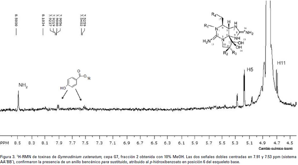 El espectro de 1H-RMN de la de fracción 2 (10% MeOH) exhibió una señal simple en 8.5 ppm, que corresponde a los protones de los iminos de la saxitoxina. Las dos señales dobles centradas en 7.91 y 7.53 ppm corresponden al sistema AA'BB', característico de un anillo bencénico para sustituido; estas señales se atribuyeron al grupo p-hidroxibenzoato en posición 6 del esqueleto base de la saxitoxina. Se observaron dos señales: en 5.16 y 4.67 ppm, parcialmente enmascaradas por la señal intensa del agua intercambiada del disolvente, de acuerdo a las atribuciones reportadas por Negri et al. (2003) (Fig. 3). La primera señal corresponde al protón H-5 del heterociclo base de saxitoxina acoplado al H6 y al NH vecinal; la segunda señal es atribuida al protón H11 (R2, R3 = H), acoplado al metileno H10.