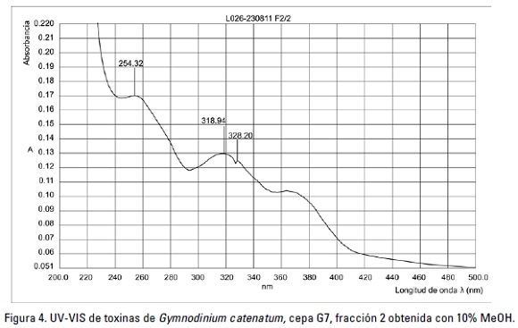 Los desplazamientos químicos observados en RMN de protón (1H-RMN), así como el análisis ultravioleta de la fracción 2, confirmaron la presencia del heterociclo base de saxitoxina, así como la presencia de grupos p-hidroxibenzoato.