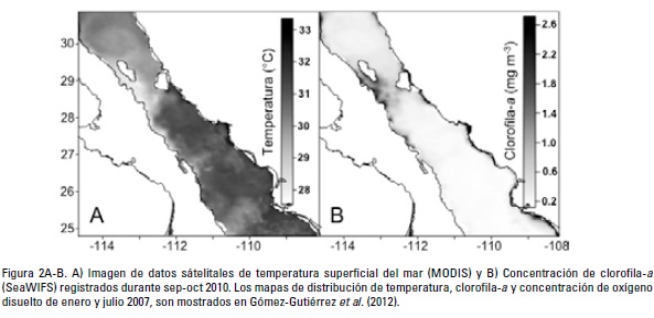 Los patrones de distribución de la temperatura superficial y la concentración de clorofila-a, inferida mediante imágenes de satélite, durante los cruceros de enero y julio 2007, fueron descritos por Gómez-Gutiérrez et al. (2012). Los mapas de distribución de temperatura superficial y concentración de clorofila-a, detectados por satélite, durante el crucero de septiembre-octubre 2010, se presentan mediante el análisis de imágenes de temperatura semanales del sensor MODIS/Aqua (Moderate Resolution Imaging Spectral-radiometer, 9 km resolución) (MODIS/Aqua, 2007) (Fig. 2A) e imágenes de concentraciones de clorofila-a superficial del satélite SeaWIFS (SeaWIFS, 2007), 4 km resolución (Fig. 2B).