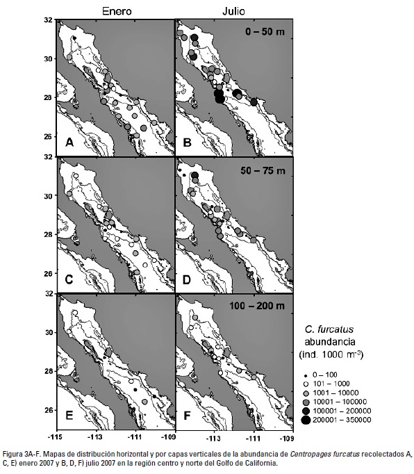 Durante julio 2007 se detectó un incremento de abundancia de C. furcatus de diez ordenes de magnitud, con respecto a lo registrado en enero 2007. Las mayores densidades se detectaron también en la capa de 0-25 m, al sur de las grandes islas y a lo largo de la costa peninsular del golfo, con densidades de hasta 350 x 103 ind. 1000 m-3 (Fig. 3 D). A diferencia del invierno, la población de C. furcatus en verano tuvo también altas densidades (hasta 200,000 ind. 1000 m-3) en la capa de 50-75 m, en toda la región muestreada y en la capa más profunda éstos se concentraron al sur de las Grandes Islas y al norte de Guaymas, con bajas densidades que fluctuaron entre 1001 a 10,000 ind. 1000 m-3 (Fig. 3 F). En general, la población de C. furcatus se concentró en la capa superficial, decreciendo considerablemente hasta capas profundas de la zona epipelágica y durante el verano se amplió la zona de distribución vertical, observándose las mayores densidades en la capa 0-75 m, en la parte central y norte del Golfo de California (Fig. 3 A-F).