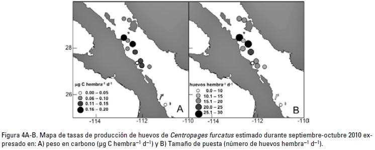 El promedio de la tasa de producción diaria de huevos de C. furcatus en aguas oceánicas de la región central y norte del Golfo de California durante sep-oct 2010 fue de 18.8 huevos hembra-1 d-1. Esta tasa está en el límite inferior del rango promedio registrado para esta especie en otras regiones (18.5-32.1 huevos hembra-1 d-1, pero la tasa máxima registrada en el presente estudio (70 huevos hembra-1 d-1) fue cercana al máximo conocido para la especie (Bahía de La Paz, 75 huevos hembra-1 d-1) (Tabla 1). En general, en el Noroeste de México, bajo condiciones ambientales frías esta especie tiene bajas tasas de producción de huevos e incrementa sus tasas de producción de huevos durante el verano, con una evidente tendencia estacional en sus tasas de reproducción. Durante el presente estudio y otras regiones estudiadas (Tabla 1) es evidente que las mayores tasas de producción de huevos promedio se detectan en zonas neríticas (bahías), en comparación con la registrada en regiones oceánicas.