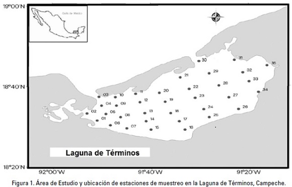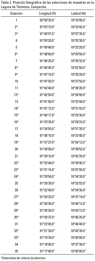 El material analizado se obtuvo durante el desarrollo del proyecto JEST (Joint Environmental Study of Terminos Lagoon) efectuado entre el IRD (L'Institut de Recherche pour le Développement) y la Universidad Autónoma Metropolitana Unidad Iztapalapa. Los especímenes analizados se obtuvieron a partir del análisis de muestras de zooplancton recolectadas con base en una red de 35 estaciones establecidas en la laguna (Fig. 1); aunque no en todas ellas se encontraron medusas (Tabla 2. *Estaciones de colecta de medusas). En el área de estudio (18°52' y 19°00' N y 91°15' y 92°00' W), los muestreos se efectuaron en marzo y octubre de 2009, así como en noviembre de 2010 (Tabla 2). Se utilizó una red estándar con 30 cm de diámetro de boca, largo de 90 cm y luz de malla de 250 um. La red fue arrastrada durante 5 minutos a una velocidad entre 1 y 1.5 nudos, y aproximadamente a 50 cm de la superficie. Las muestras se fijaron con formol al 4%, neutralizado con borato de sodio, y posteriormente fueron selladas y trasladadas al Departamento de Hidrobiología de la Universidad Autónoma Metropolitana Unidad Iztapalapa para su análisis. Adicionalmente, se midió in situ la temperatura y la salinidad del agua mediante una sonda CTD Seabird SB19.