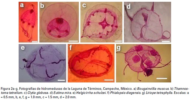 Se analizó la composición y abundancia de las medusas presentes en 42 muestras de zooplancton de la Laguna de Términos, Campeche que fueron recolectadas durante marzo y octubre de 2009 y noviembre de 2010. Se identificaron siete especies, seis de ellas son nuevos registros geográficos para este sistema costero y una (Phialopsis diegensis) es también un nuevo registro para el Atlántico mexicano. Considerando todo el periodo estudiado, la especie más abundante fue Helgicirrha schulzeicon el 52.24% del total de medusas examinadas, seguida por Bougainvillia muscus con el 18.04%. La presencia de P. diegensis y otras especies no registradas anteriormente en la zona, pueden ser resultado de la influencia oceánica en este sistema o bien son posibles especies invasoras derivadas del impacto de las actividades humanas y el tráfico marítimo, actividades que afectan principalmente a las comunidades del zooplancton en las lagunas costeras.