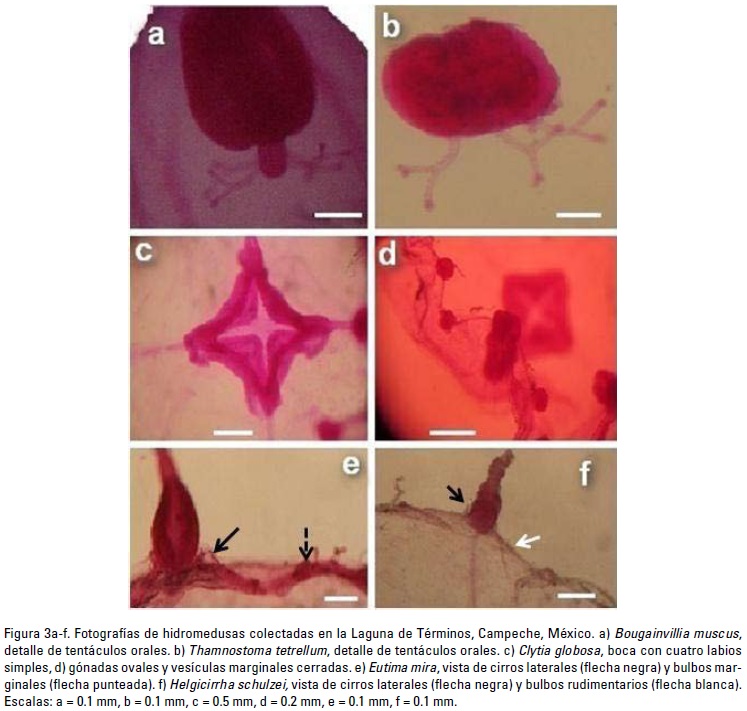 Caracteres diagnósticos: Es el primer registro geográfico de esta especie en la Laguna de Términos. Su característica distintiva es la presencia de tentáculos orales divididos 1-2 (raramente 3 veces; Fig. 3a).