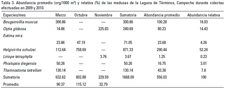 Abundancia y riqueza de especies: La abundancia promedio de las medusas encontradas (Tabla 3) osciló entre 32.79 (noviembre) y 115.12 (octubre) org/1000 m3. En marzo B. muscus fue la especie más abundante con 300.86 org/1000 m3, seguida por T. tetrellum con 130.14 org/1000 m3; ambas especies representaron el 68.2% del total de medusas. Durante este mes se presentó la mayor diversidad de especies. En octubre solamente se presentaron dos especies pero la abundancia total de medusas fue mayor que en los otros meses, E. mira y H. schulzei tuvieron una abundancia promedio de 23.68 y 290.44 org/1000 m3, respectivamente. En noviembre también se presentaron solo dos especies y la abundancia promedio fue la más baja de todo el periodo estudiado, C. globosa y L. tetraphylla tuvieron una abundancia promedio de 1.25 y 80.23 org/1000 m3, respectivamente. De las especies encontradas con anterioridad en la Laguna de Términos por Canudas-González (1979), solo L. tetraphylla fue encontrada en las muestras estudiadas en la presente investigación. Las 6 especies restantes encontradas representan nuevos registros geográficos para la Laguna de Términos e incluso Phialopsis diegensis constituye un nuevo registro para el Atlántico Mexicano.